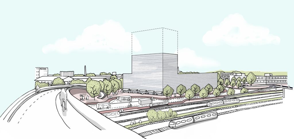 Visualisierung der neuen Quartiersmitte Am Westbahnhof | Quelle: berchtoldkrass – space and options