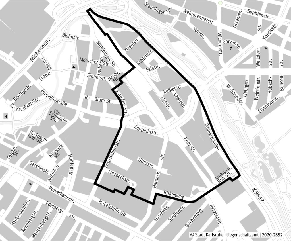Abgrenzungsplan des Sanierungsgebiets „Gewerbegebiet Grünwinkel“. | Quelle: Stadt Karlsruhe, Liegenschaftsamt