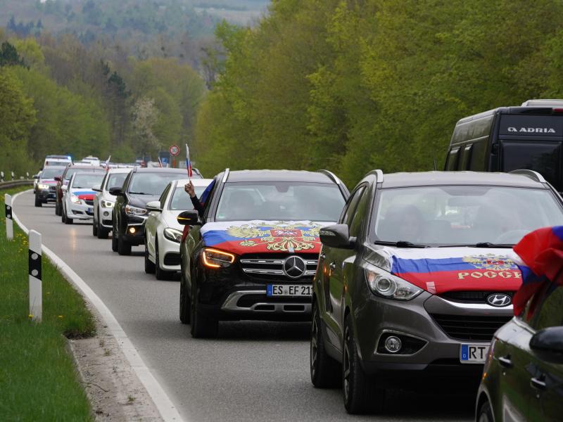 Die Wagen fuhren nach Polizeiangaben teils mit russischen Fahnen auf den Motorhauben und an den Fenstern von der Hochschule Reutlingen in Richtung Innenstadt und später wieder zum Ausgangspunkt zurück.