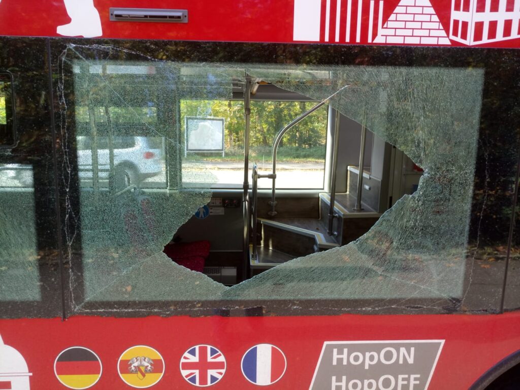 Der rote Doppeldeckerbus der in der Fächerstadt oft seine Runden für Stadtrundfahrten dreht, wurde in der Nacht vom 4. auf den 5. November beschädigt. Unbekannte haben die Scheiben des Busses eingeschlagen – der Schaden beläuft sich auf rund 12.000 Euro.