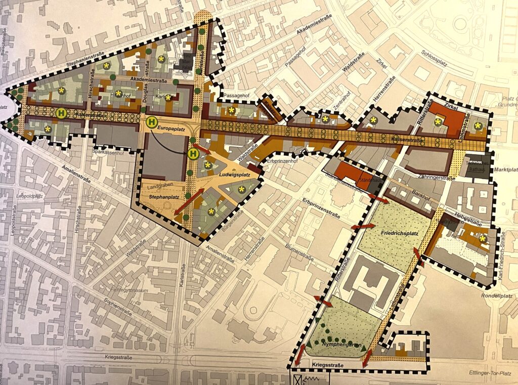 In den Jahren 2024/2025 wolle man zudem eine Haltestelle zwischen der Leopoldstraße und der Hirschstraße umsetzen. Auch beinhalte das Neuordnungskonzept eine Anbindung der Leopoldstraße an die „grünen Dreiecke des Kaiserplatzes“.