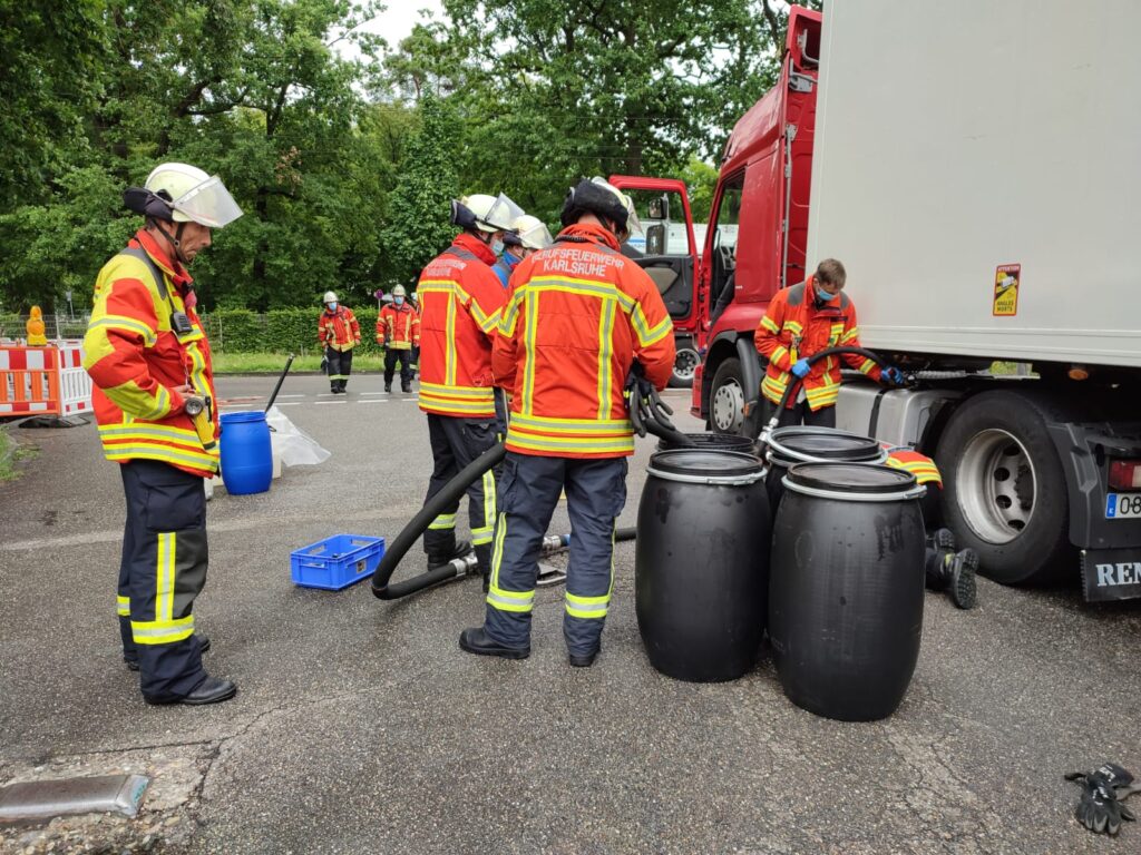 Am Mittwoch, 30. Juni 2021, kam es zu einem Unfall mit einem Sattelschlepper in der Karlsruher New-Jersey-Straße, Ecke Erzbergerstraße. Wie die Feuerwehr Karlsruhe berichtet, riss einem Sattelzug beim Rangieren eine Leitung des Fahrzeugtanks.