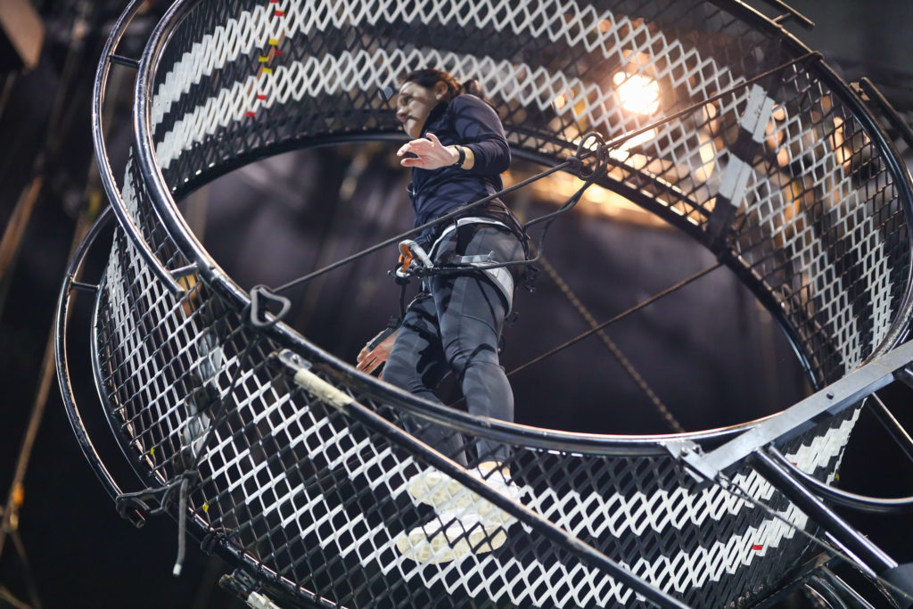 Mühelos laufen und springen die beiden Profis Haurigui Perez Navas und Robinson Valencia Lozada im Todesrad des Circus Flic Flac – bevor der Stahlkoloss zum Stehen kommt und klar ist: Nun kommt meinKA dran! Robinson Valencia Lozada erklärt die wichtigesten Dinge in wenigen Sätzen – immer die Position halten, nicht vornüber kippen und einfach laufen – soweit sogut, klingt eigentlich simpel…
