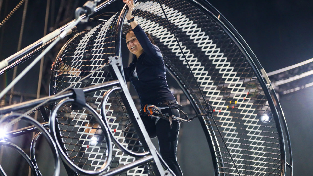 Mühelos laufen und springen die beiden Profis Haurigui Perez Navas und Robinson Valencia Lozada im Todesrad des Circus Flic Flac – bevor der Stahlkoloss zum Stehen kommt und klar ist: Nun kommt meinKA dran! Robinson Valencia Lozada erklärt die wichtigesten Dinge in wenigen Sätzen – immer die Position halten, nicht vornüber kippen und einfach laufen – soweit sogut, klingt eigentlich simpel…