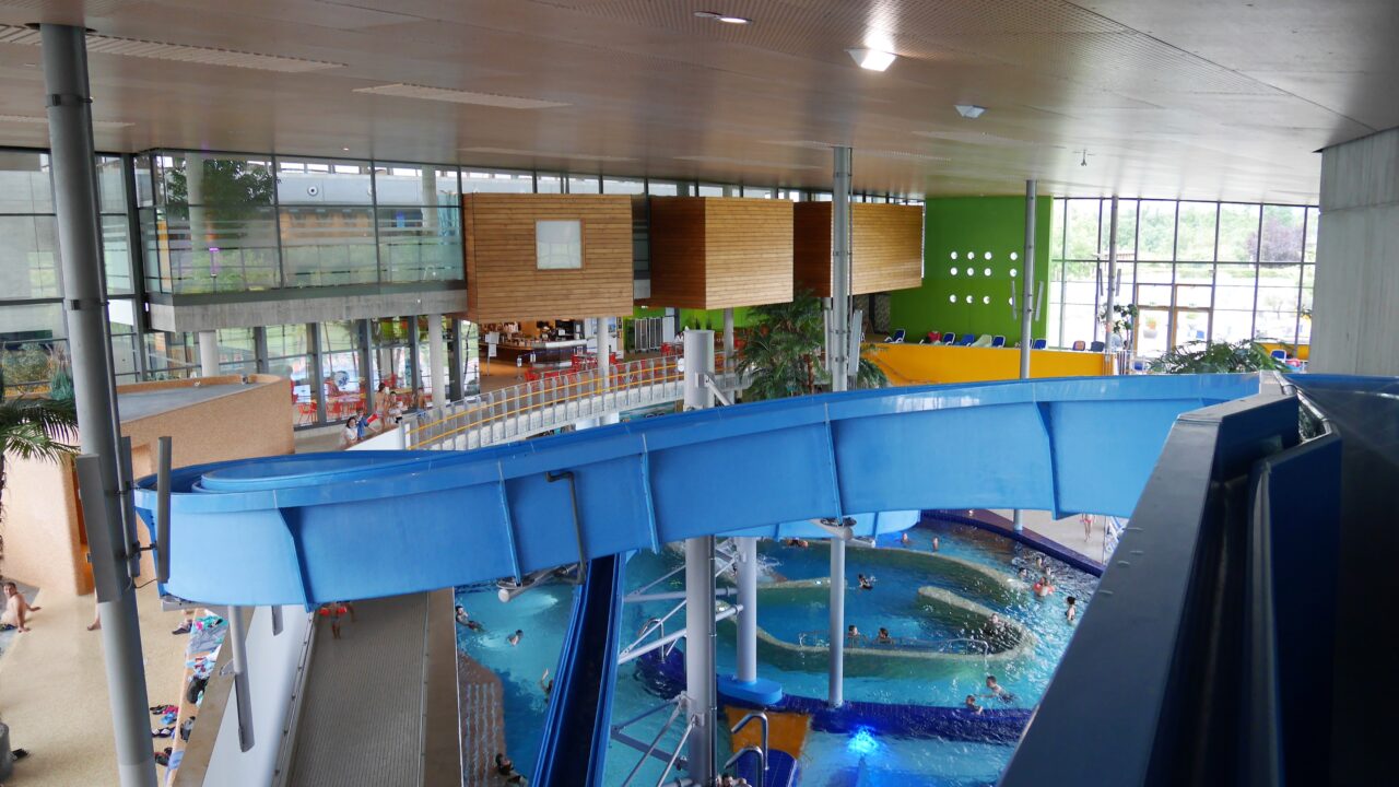 Die neue Wasserrutsche verläuft in acht Metern Höhe über dem Erlebnisbecken im Innenbereich des Bades. Auf einer Gesamtlänge von 61 Metern und einem Gefälle von 12 Prozent können die Rutschenden ihre Surf-Fähigkeiten testen.