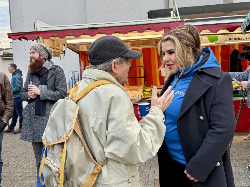 Auf dem Wochenmarkt in Rüppurr beantworteten Karlsruhes Oberbürgermeister Dr. Frank Mentrup und Stadtwerke-Geschäftsführerin Iman El Sonbaty die Fragen der Bürgerinnen und Bürger zur Kampagne „Zukunftsbaustein“