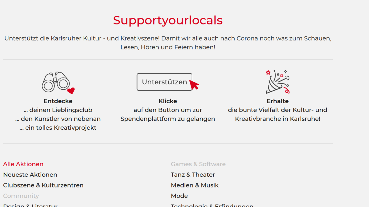 Um den betroffenen zu helfen bietet das K³ Kultur- und Kreativwirtschaftsbüro Karlsruhe nun eine gebündelte Übersichtsseite mit dem Namen „Supportyourlocals“, die alle Spenden- und Crowdfunding-Aktionen in der Fächerstadt, die auf unterschiedlichen Plattformen im Bereich der Kultur- und Kreativszene derzeit laufen vereint.