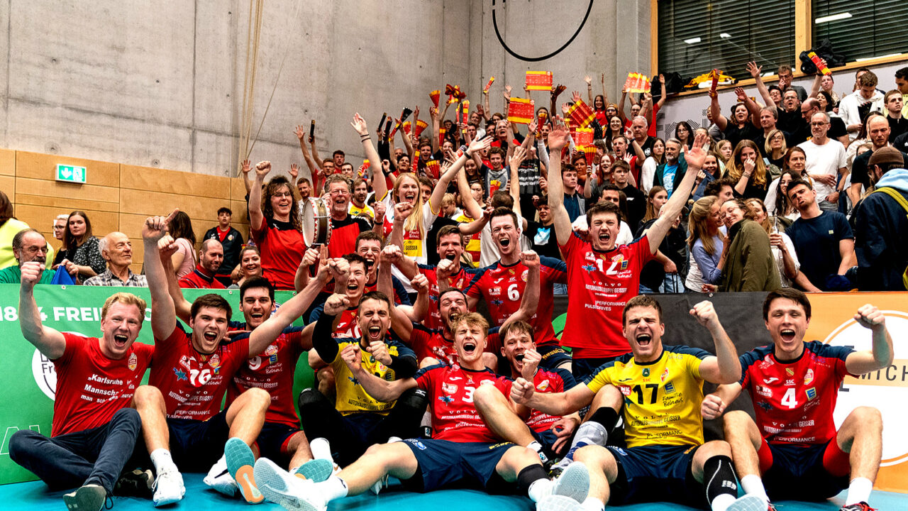 Die BADEN VOLLEYS SSC Karlsruhe sind Meister der zweiten Volleyball-Bundesliga Süd 2023. Mit einem 3:0-Sieg am vorletzten Spieltag beim FT Freiburg haben die Karlsruher ihren Titel aus dem Vorjahr verteidigt – und steigen in die erste Bundesliga auf.