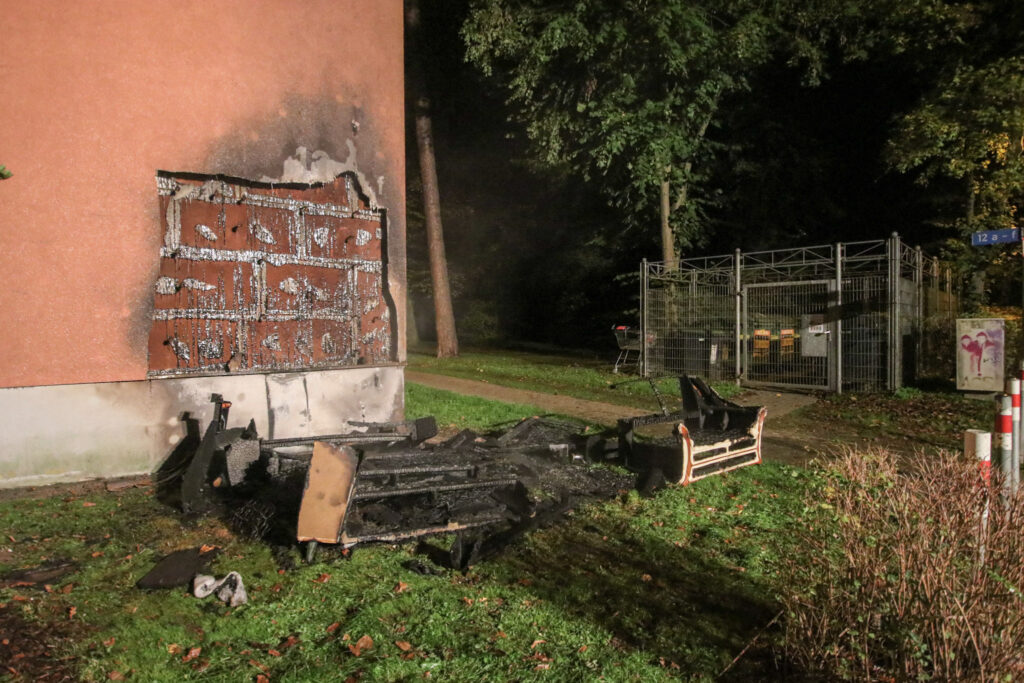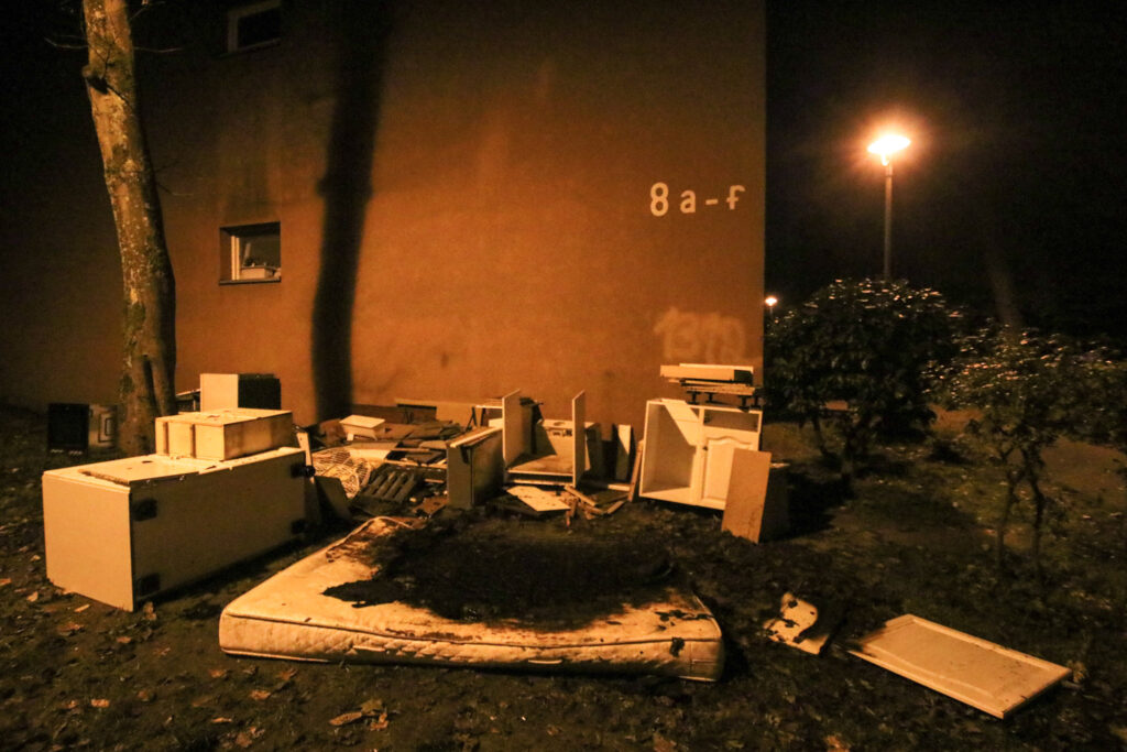 Offenbar setzten Unbekannte Sperrmüll in Brand, der vor mehreren nebeneinanderliegenden Gebäuden abgestellt war. Eine Hausfassade sowie eine Straßenlaterne wurden dabei beschädigt.
