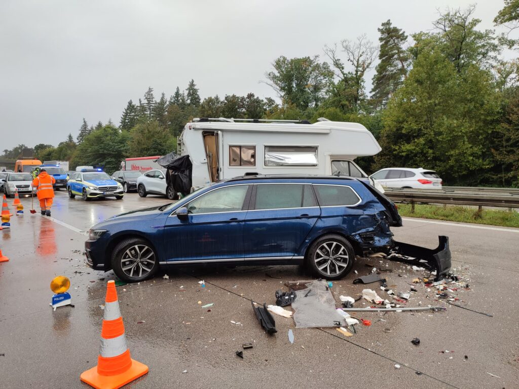 Ein 41-Jähriger mit seinem Passat erkannte diesen Stau auf dem linken Fahrstreifen erst spät, konnte aber noch vor dem Wohnmobil auf den mittleren Fahrstreifen wechseln. Hierdurch mussten beide Fahrer offenbar stark bremsen. Der hinter dem Wohnmobil fahrende Sattelzug konnte nun einen Unfall nicht mehr vermeiden.