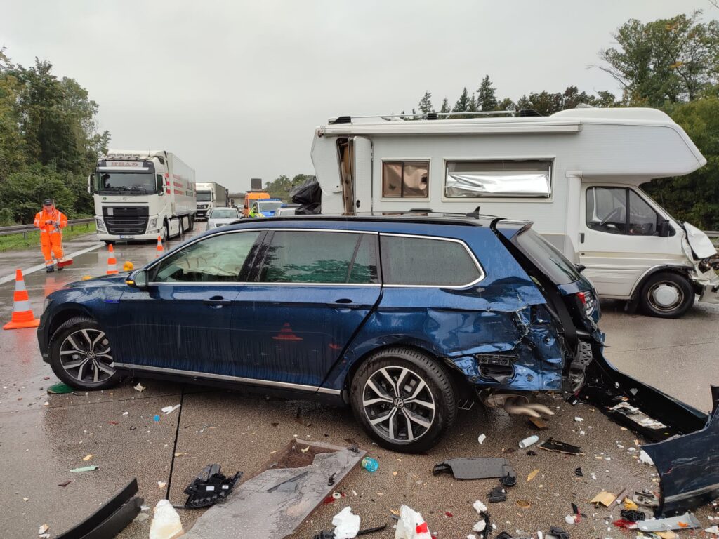 Er fuhr auf das vor ihm fahrende Wohnmobil auf, dieses wurde durch die Wucht des Aufpralls auf den vor ihm fahrenden Passat des 41-Jährigen aufgeschoben. Das Wohnmobil wurde noch auf den linken Fahrstreifen abgewiesen und kollidierte dort mit dem Skoda eines 30-jährigen Mannes. Durch diese Kollision wurden in der Folge noch der Ford und ein weiterer Passat aufeinander geschoben, so die Polizei.