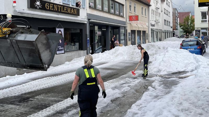 Winterdienst-Einsatz mitten im Sommer: Ein lokal begrenztes Unwetter hat Straßen in der Innenstadt von Reutlingen am Freitag mit einer 30 Zentimeter hohen Hagel-Schicht überzogen.