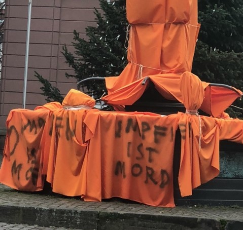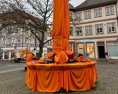 Unbekannte in der Nacht zum 1. Advent den vom Soroptimist Club Karlsruhe im Rahmen der „Aktion Orange Day- NEIN zu Gewalt an Frauen“ mit orangenen Tüchern verhüllten „Liebesbrunnen“ in Durlach stark mit Parolen beschmutzt, darüber informiert der Verein.