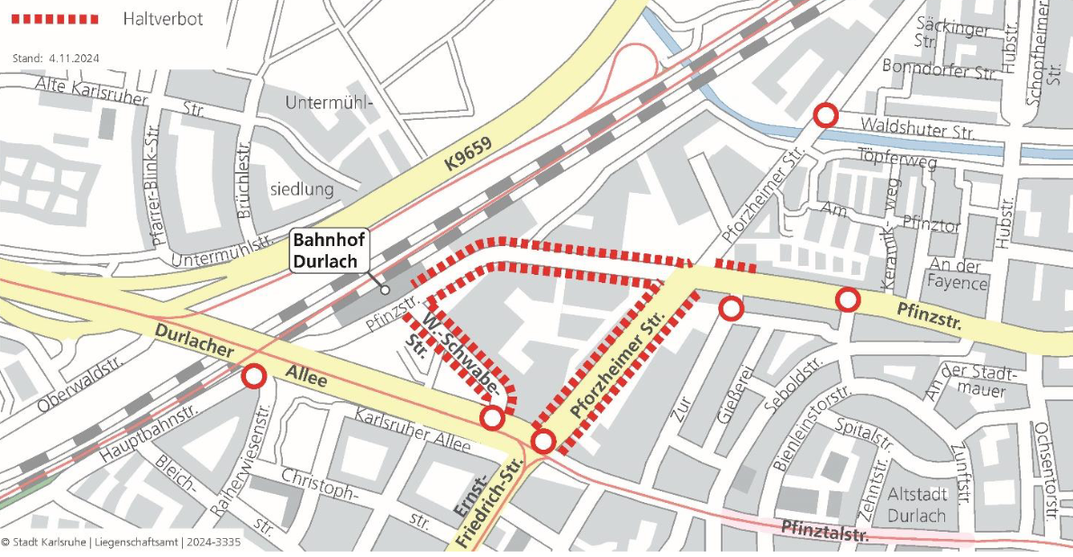 Karte über die Halteverbote im Versammlungsbereich am 9. November in Durlach © Stadt Karlsruhe