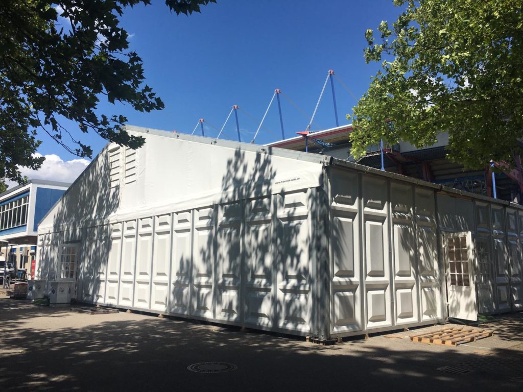 Bereit seit einigen Jahrzehnten ist das KSC-Clubhaus vor der Haupttribüne des Wildparkstadions fester Treffpunkt für die Fans des Karlsruher SC. Im Zuge des Stadionneubaus muss diese Kultstätte allerdings zum Ende der Saison 2019/2020 abgerissen werden. Damit schon frühzeitig eine Alternative bereit steht und der Abschied nicht allzu schwer fällt, schafft der KSC schon zum Saisonbeginn, beziehungsweise zum ersten Heimspiel des KSC gegen Dynamo Dresden am Samstag, den 03. August 2019, für die Zeit bis das neue Stadion komplett fertiggestellt ist, eine Übergangslösung.