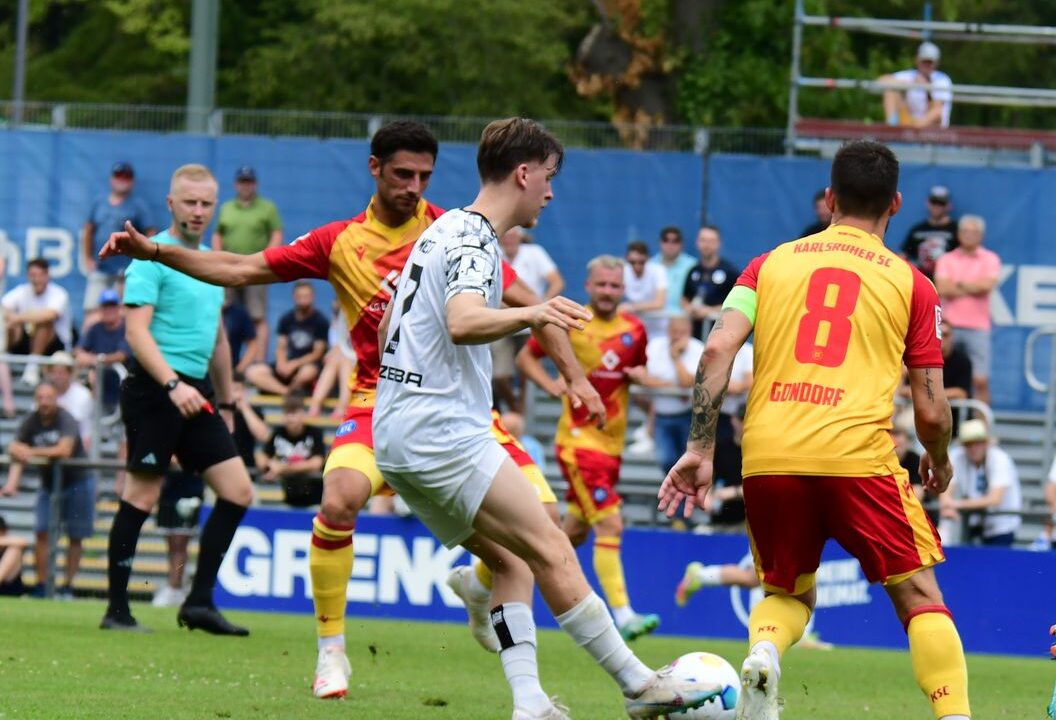 Der KSC, der am Mittwoch gegen den englischen Spitzenclub FC Liverpool sein umgebautes Stadion offiziell eröffnen wird, hatte von Beginn an viel Ballbesitz und hätte schon in der ersten Halbzeit in Führung gehen müssen. Jedoch verschoss Paul Nebel einen Foulelfmeter (43.).