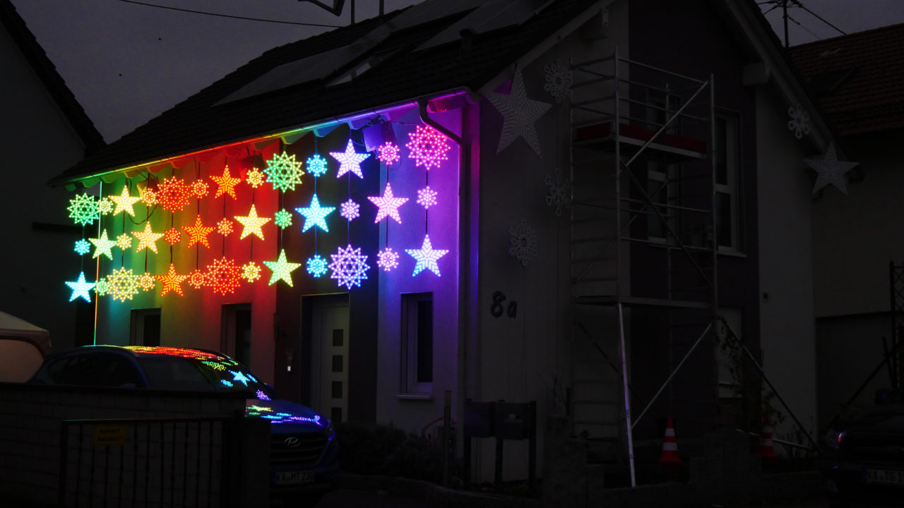 Das Highlight 2019 ist die Seite des Hauses, die komplett neugestaltet wurde. 13 Reihen aus Sternen und Schneeflocken sind dort montiert, die Grüger in den verschiedensten Farben leuchten lassen kann. „Wir wollten erst Bögen über der Hofeinfahrt machen, aber die Befestigung war schwierig, und dann haben wir es einfach an der Seite probiert und fanden es total cool“, sagt er stolz. Folien mit LED-Streifen kommen zudem in die Fenster. Dadurch erhält Grüger eine Art Lichter-Leinwand, die er bespielen kann. 2019 soll die Show zu Musik aus den 1960ern und 1970ern laufen. Der traditionelle Baum darf natürlich nicht fehlen und in diesem Jahr gibt es sogar einen „Lichter-Wasserfall“, der die Hauswand hinunterlaufen soll. Mehr wird noch nicht verraten.