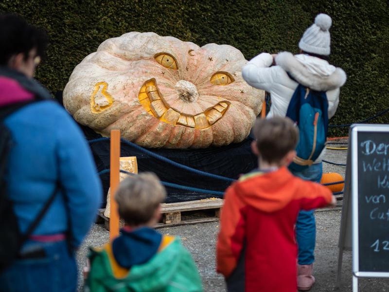Bei der Kürbisausstellung in Ludwigsburg ist aus dem Weltrekord-Gemüse ein großer Kürbisgeist geschnitzt, von innen beleuchtet und am Samstagabend der Öffentlichkeit präsentiert worden. Das Kunstwerk werde die traditionelle Ausstellung in den Gärten des Blühenden Barocks voraussichtlich noch bis zum kommenden Wochenende schmücken, teilte eine Sprecherin des Veranstalters mit.