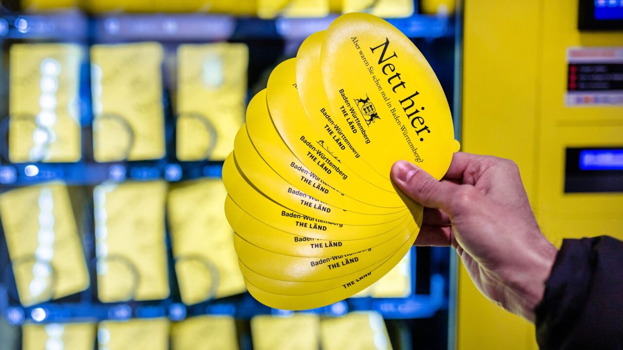 Die Sticker habe er vergessen, sagt er in einer kurzen Instagram-Story – und kauft sich nach der Sicherheitskontrolle am neuen gelben Automaten noch eine Packung Aufkleber. Zehn Sticker der Kampagne «Nett hier. Aber waren Sie schon mal in Baden-Württemberg?» für einen Euro, nun auch in deutscher und englischer Sprache. Der Spruch ist seit den späten 1990ern ein Exportschlager des Landes.