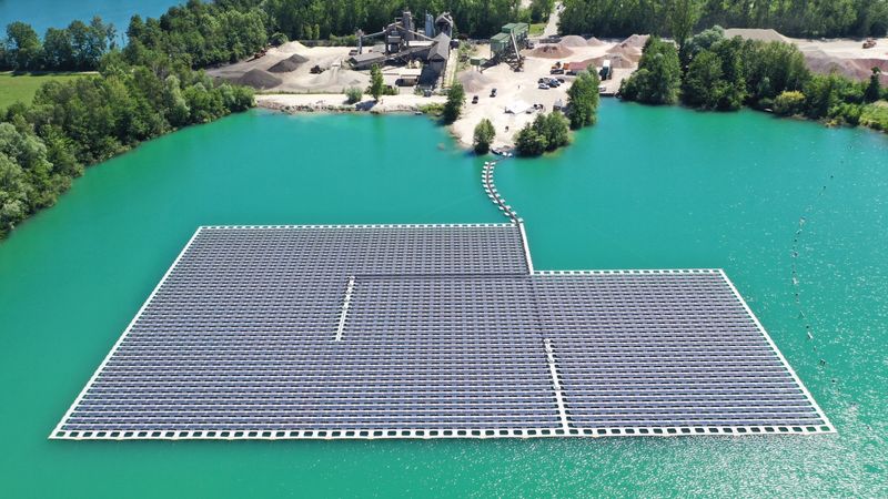 Mit Hilfe schwimmender Photovoltaik-Anlagen auf Baggerseen können Kieswerkbetreiber einen Teil des benötigten Stroms für ihre Maschinen vor Ort produzieren.