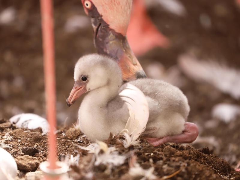 Ein Zwergflamingo-Küken ist in der Osterwoche im Zoo Karlsruhe geschlüpft. Das teilte Sprecher Timo Deible am Freitag, 02. April 2021, mit.