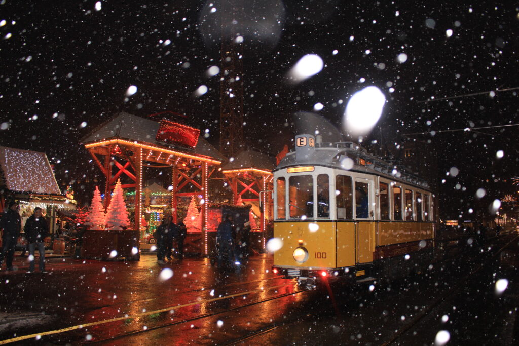 Mit einem feierlichen Korso durch die Fußgängerzone verabschiedet sich die Straßenbahn nach 144 Jahren am Sonntag, 12. Dezember 2021 aus der Karlsruher Kaiserstraße.