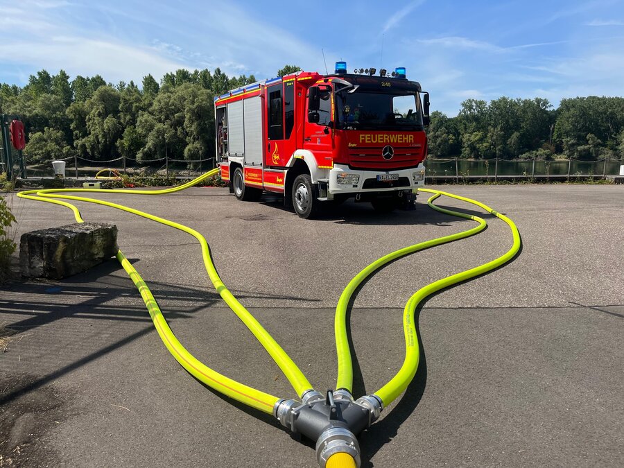 In Philippsburg übte der Zug Wasserförderung AB-Wasserförderung gemeinsam mit der Werkfeuerwehr des Kernkraftwerks Philippsburg ein komplexes Szenario im Energiepark: