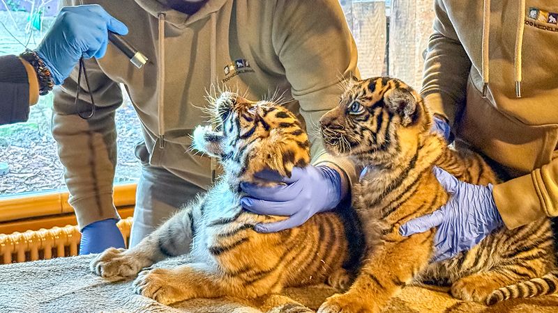 Der Check der beiden Jungtiere sei erfreulich gewesen. Die Tiger seien gesund und munter. Herz, Lunge, Augen, Zähne und auch das Gewicht – alles bestens. Ein bisschen hätten die Mädels gefaucht während der Untersuchung, sich aber ansonsten vorbildlich verhalten. Direkt nach dem Tierarzttermin kamen sie zurück zu ihrer Mutter. Namen haben sie noch nicht.